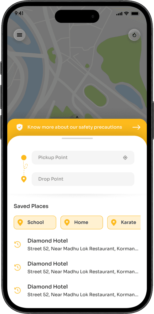 The interface allows parents to conveniently choose their pickup and drop locations through recognizable features. They can opt to search for locations directly or leverage the map feature to pinpoint the exact locations themselves. This choice allows for a more flexible and user-friendly approach, familiar to users accustomed to various ride-hailing applications, ensuring a seamless and effortless experience from the outset.